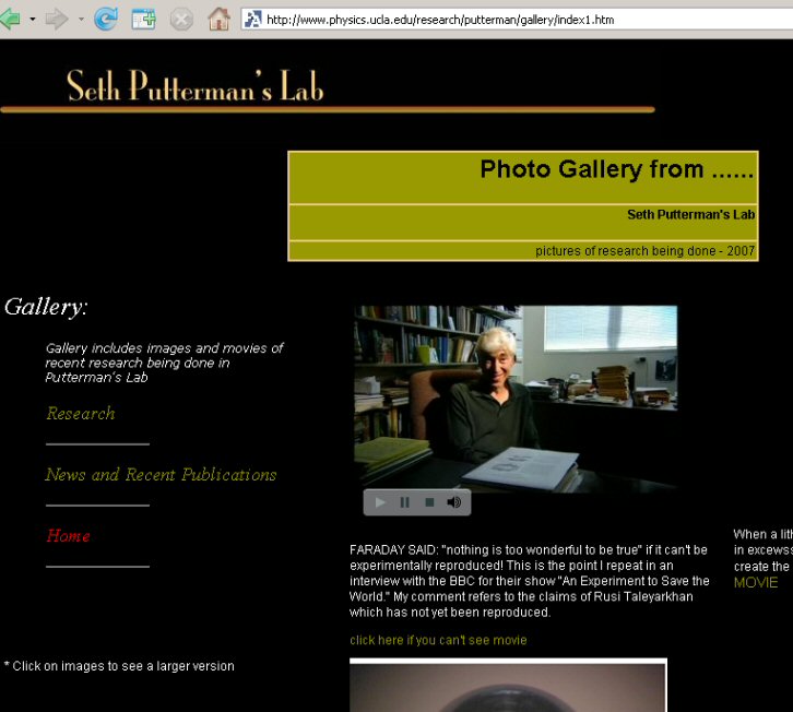 Nov. 17, 2008 - Seth Putterman: Screen capture of his Web site promoting his failure to replicate the Taleyarkhan et al. experiment and his aspersions that Taleyarkhan et al's claims are false because he failed to reproduce them