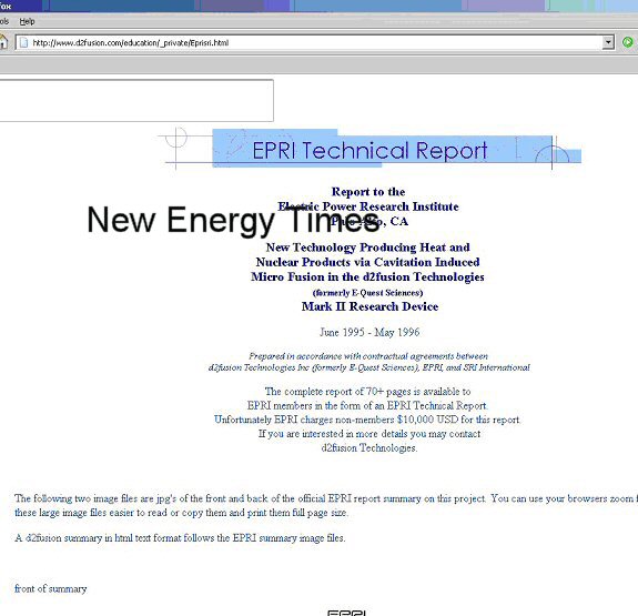 One of George's other talents is document fabrication. Before my first investigation on D2Fusion, George had displayed a Web page showing what appeared to be the cover page of an EPRI technical report. The actual report cover pages look like this. George's version looks like this, which displays multiple inconsistencies with the facts.