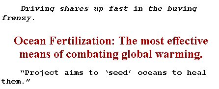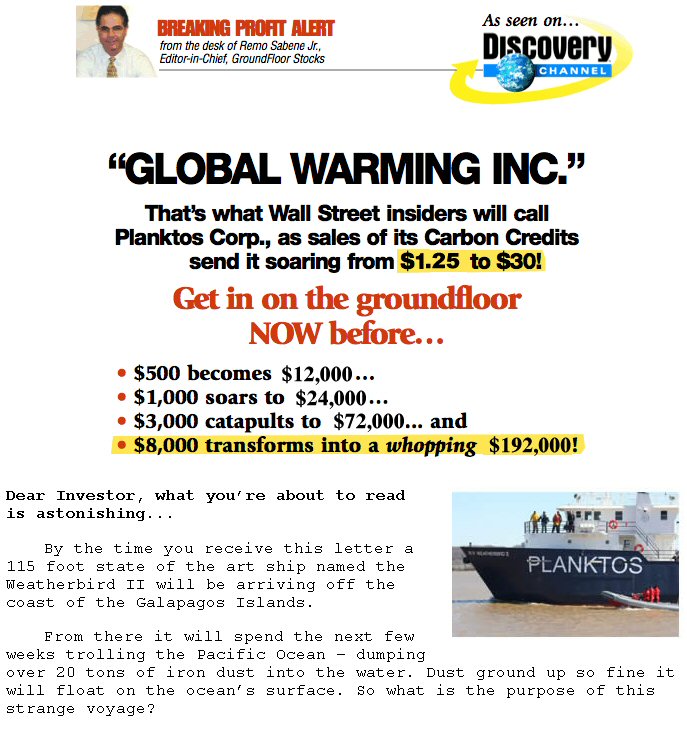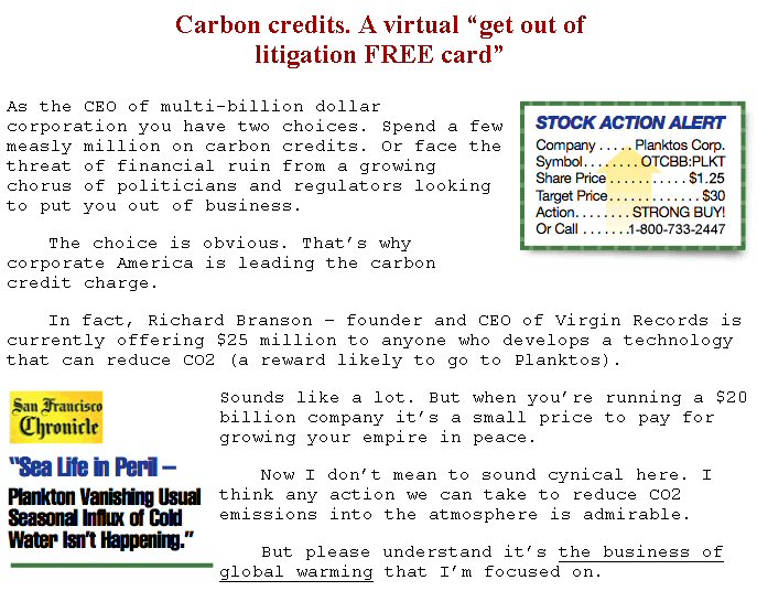 The net effect is that they create the appearance of something new, something lucrative to lure new investors, and a greater ability to promote Planktos Corp., separate from their other companies, as the billion dollar carbon-trading market begins to blossom.