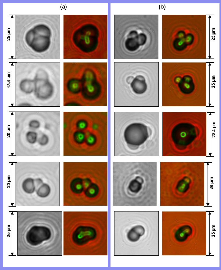 In the image below, the two columns on the left (a) are experiments conducted with the cathode in direct contact with the CR-39 detector. The two columns on the right (b) are experiments conducted with a 60-micron thick polyethylene film between the cathode and the CR-39 detector. For both pairs of columns, (a) and (b), the images on the left in each column were obtained with the focus on the surface of the CR-39 detector, and the images on the right are an overlay of two images taken at two different focal lengths (surface and bottom of the pits).