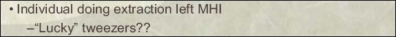 According to research scientist David Kidwell and his colleagues at the Naval Research Laboratory, the transmutation claims made by LENR researchers at Mitsubishi Heavy Industries in Japan may be the result of an MHI researcher who is no longer employed there who contaminated the experiment with "lucky tweezers."