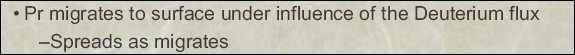 Iwamura also showed that the praseodymium appears in high concentrations in localized spots on the surface. This finding contradicts Kidwell's speculation that "praseodymium migrates to [the] surface under [the] influence of the deuterium flux [and] spreads as [it] migrates."