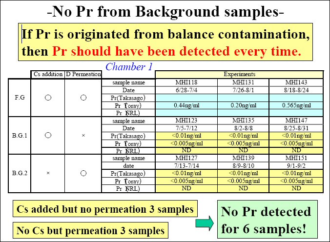 "For foreground experiments, we have positive praseodymium," Iwamura said. "But if we have only cesium and no [deuterium gas] permeation, we never get praseodymium. Also, [if we] only use [deuterium gas] permeation without cesium, we have no praseodymium for six cases ... So I can't understand why, if praseodymium originated from the balance contamination, then praseodymium should have been detected every time."