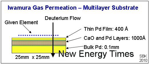The essential part of the experiment is a multilayered substrate of palladium and calcium oxide. On the surface of the substrate, the Mitsubishi researchers place atoms from a given element. Deuterium gas is passed through the substrate. As the experiment progresses, the given element is seen to decrease in quantity, and an element which was not present before the experiment slowly appears on the surface and increases in quantity.