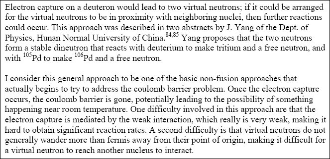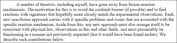 He was very straightforward and did not attempt to use sophistry to co-opt non-fusion approaches as fusion. In the next paragraph, Hagelstein explains his interest in the nonfusion, weak interaction, neutron-based hypothesis.