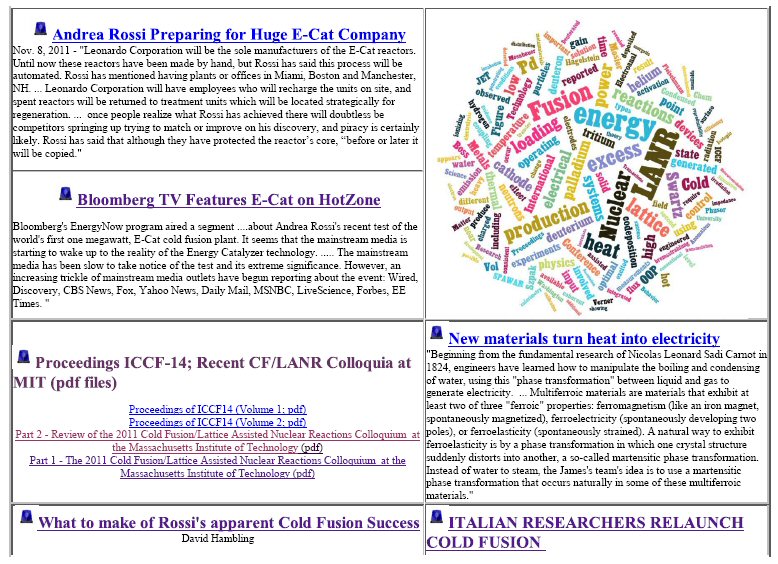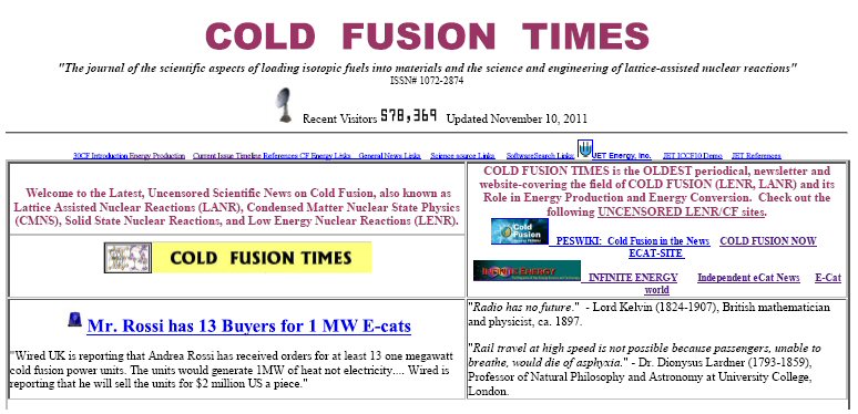 | Here are images of Swartz's home page on "Cold Fusion Times" from Nov. 10, 2011. To see an archive copy of the entire home page from that day, (153 pages if printed,) click here for the 13 MB PDF file. |