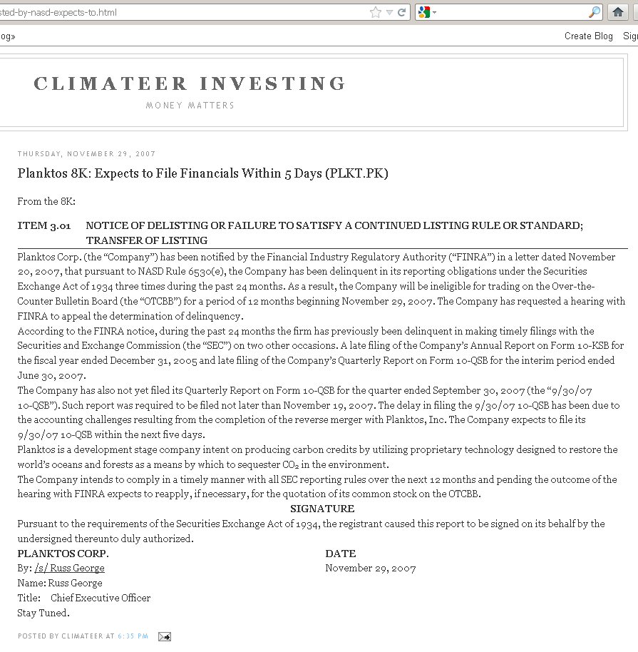 | Did Planktos Commit a Fraud Upon the Market? (Climateer Investing) Dec. 20, 2007 |