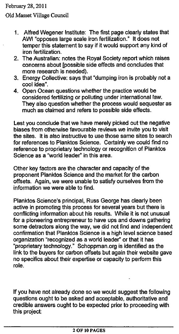 Of particular interest in Smith's investigation are documents he found: communications between the Haida Gwaii Old Masset Village Council and the Northern Savings Credit Union. The credit union performed due diligence on George and his company Planktos and warned the Old Masset Village Council of serious factual inconsistencies. Here are two excerpts from a letter from the Northern Savings Credit Union to the Old Masset Village Council, a year before George dumped the iron in the ocean: