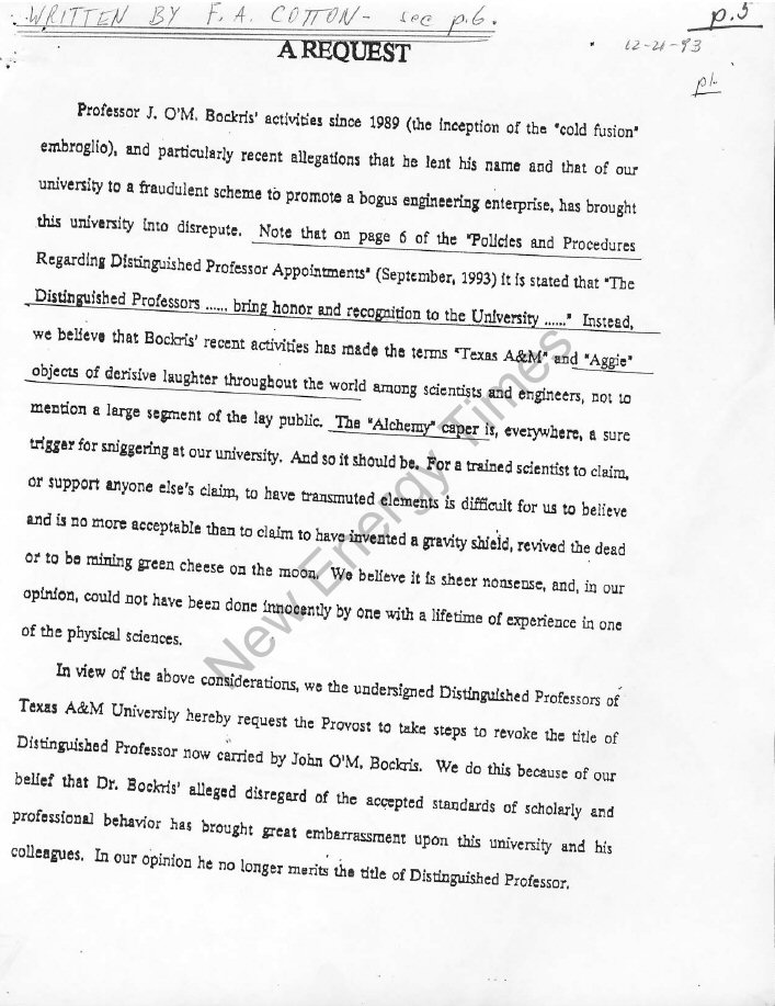 Frank Albert Cotton's Request for Bockris Revocation Back to Taubes Fraud Story Index